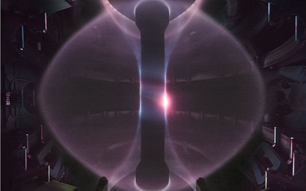 Right: A color image of a typical plasma in the Mega Amp Spherical Tokamak (MAST) fusion device at Culham (Copyright CCFE). Composite image made by Scott Silburn, James Harrison, Alex Meakins, and the Culham Centre for Fusion Energy NBI Team.