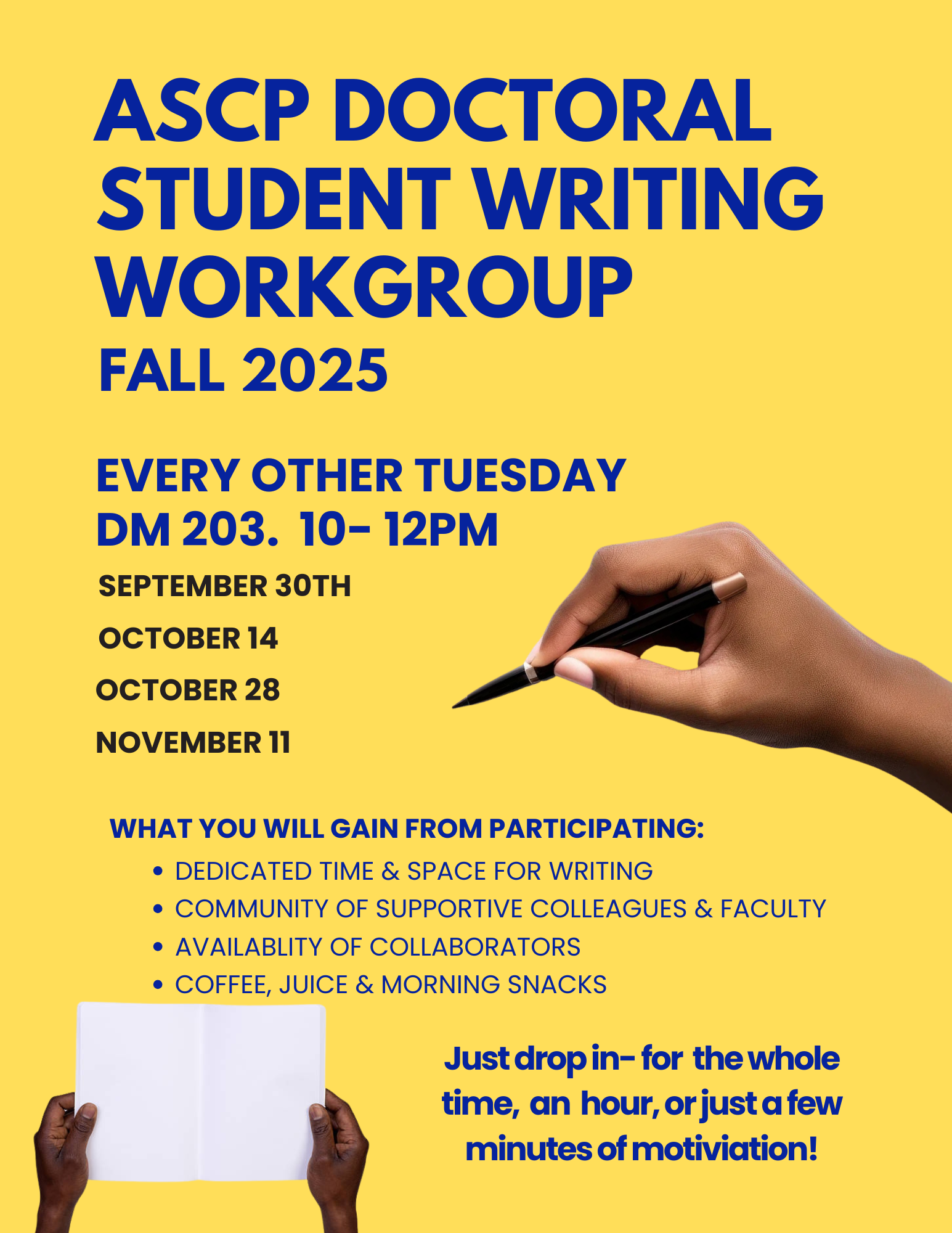 This bi-weekly writing group for doctoral students provides a structured and supportive space to make steady progress on academic writing projects. Regularly meeting over a provided breakfast encouraged shared accountability toward completing manuscripts.