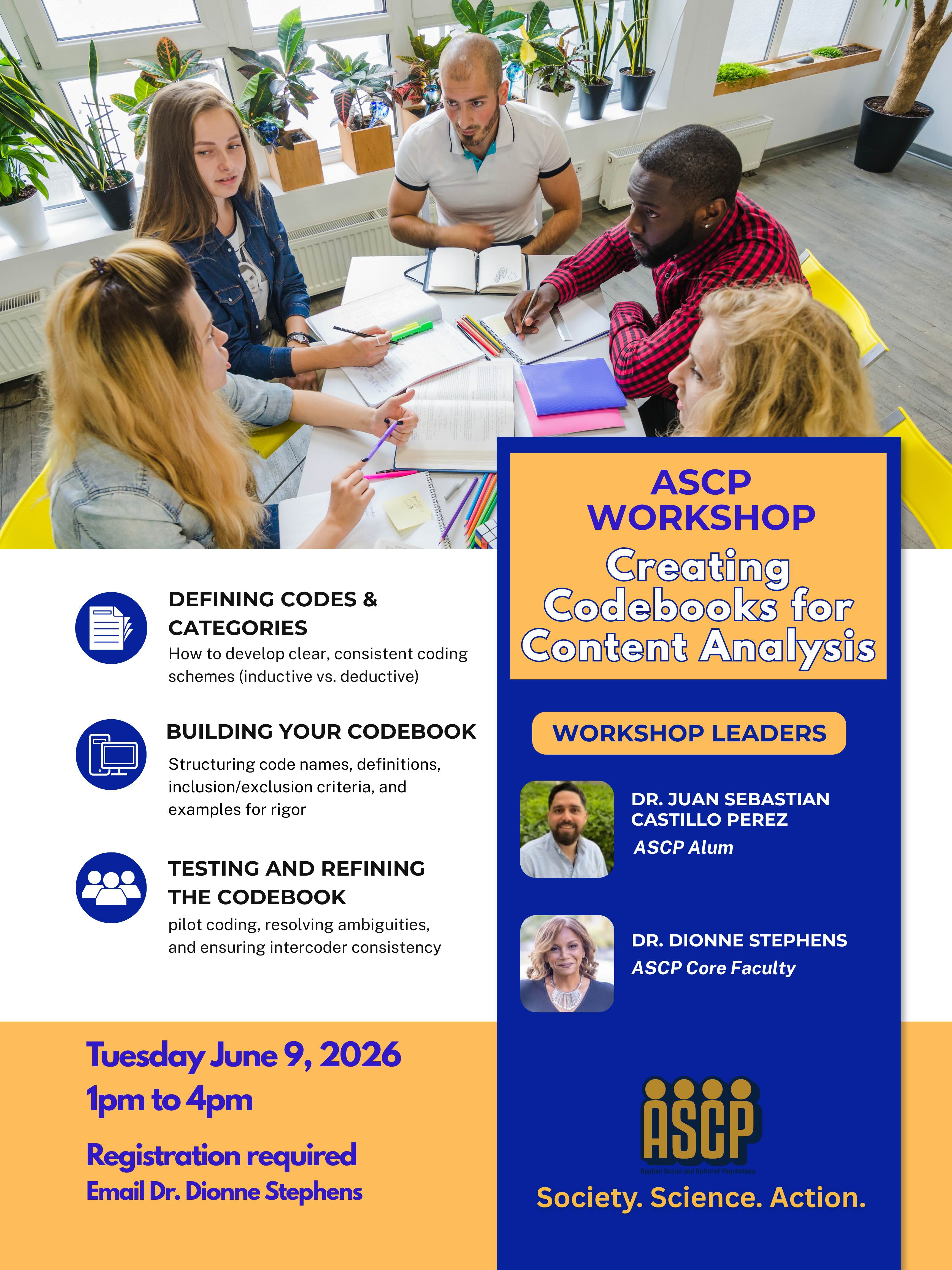 This workshop introduces fundamentals of creating and using content analysis codebooks to systematically categorize and interpret qualitative data. June 9, 2026- 1pm to 4pm Miami, FL